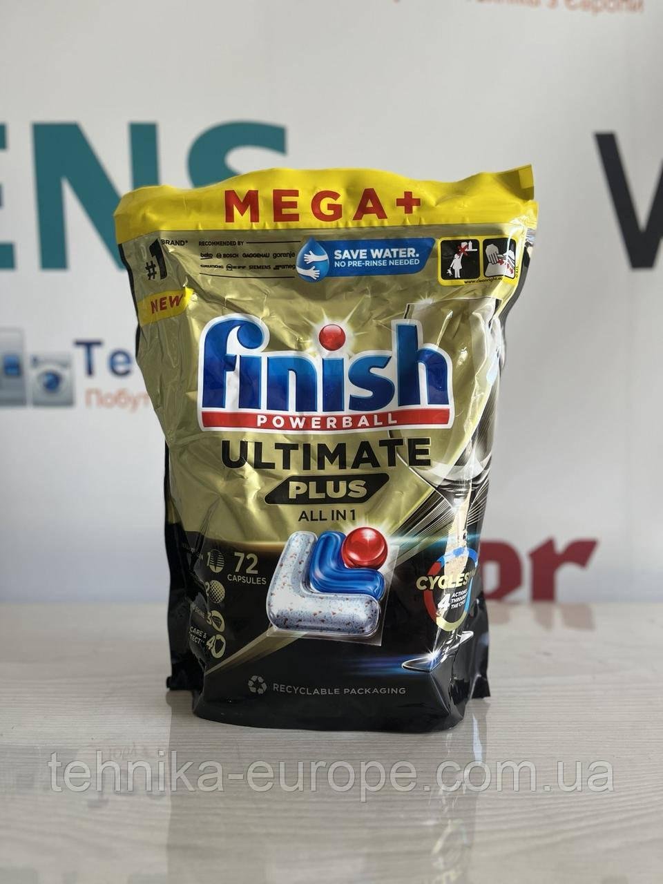 Капсули для посудомийних машин Finish Ultimate Powerball plus (все в 1) не вимагають замочування посуду перед тим, як поставити їх у посудомийну машину.* Завдяки цьому ви економите воду, а отже, гроші, і водночас дбаєте про планету. — Це не лише приємно, а й позика!